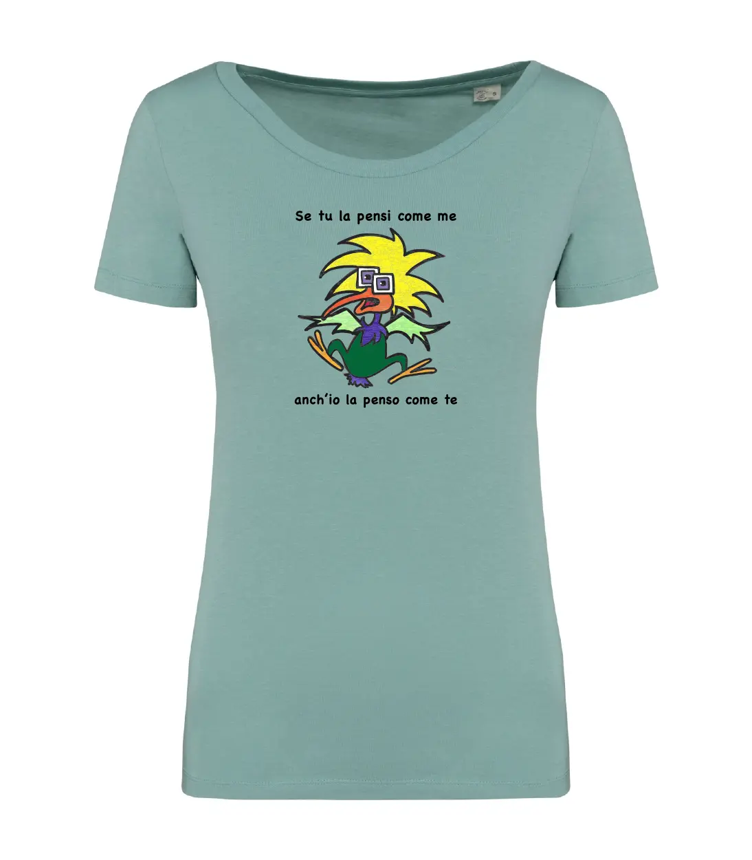 100% cotone biologico pettinato. Taglio aderente. Cuciture laterali. Capo con lavaggio agli enzimi. Collo a costine 1 x 1. Nastrino di rinforzo nel tessuto principale all’interno del collo. Finitura a doppia impuntura a fondo manica e fondo capo. Certificato STANDARD 100 by OEKO-TEX®N°CQ1007/7, IFTH