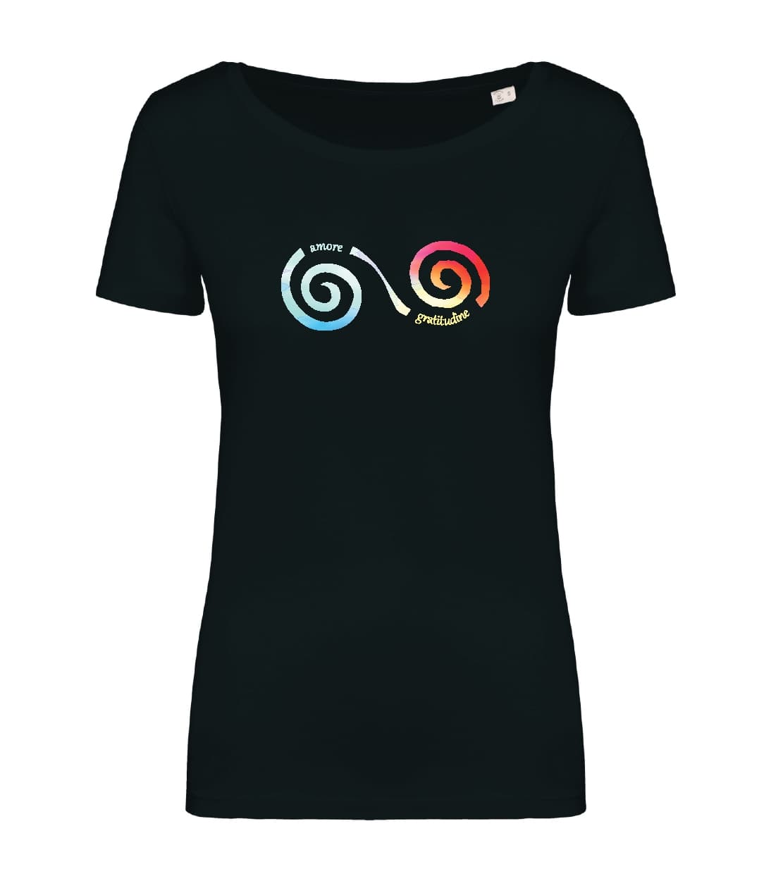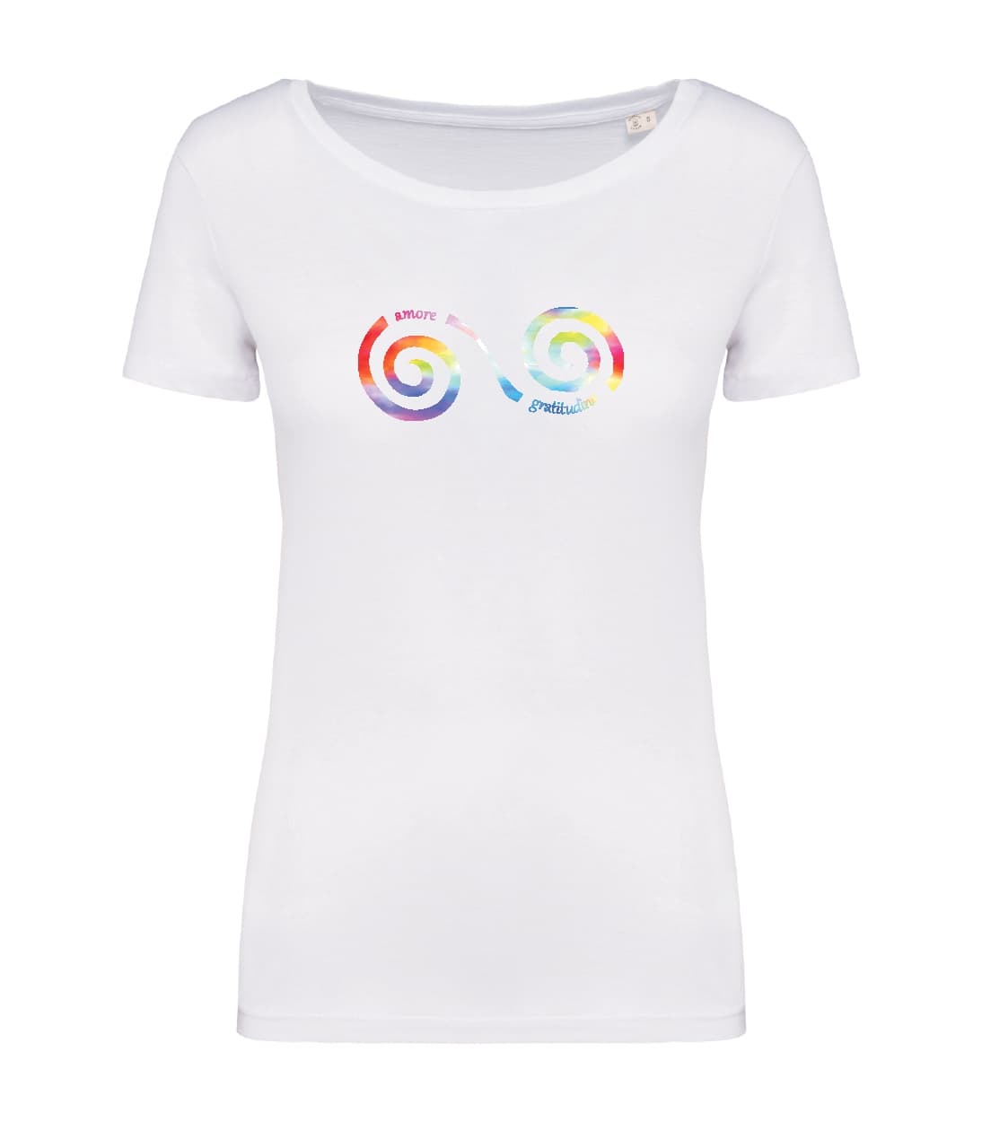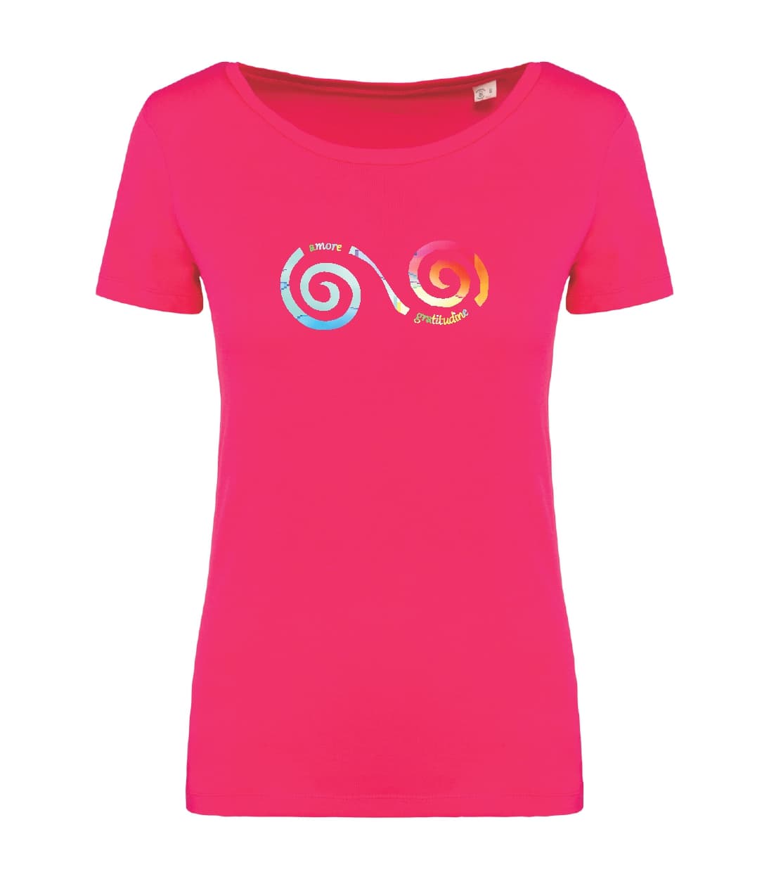 100% cotone biologico pettinato. Taglio aderente. Cuciture laterali. Capo con lavaggio agli enzimi. Collo a costine 1 x 1. Nastrino di rinforzo nel tessuto principale all’interno del collo. Finitura a doppia impuntura a fondo manica e fondo capo. Certificato STANDARD 100 by OEKO-TEX®N°CQ1007/7, IFTH
