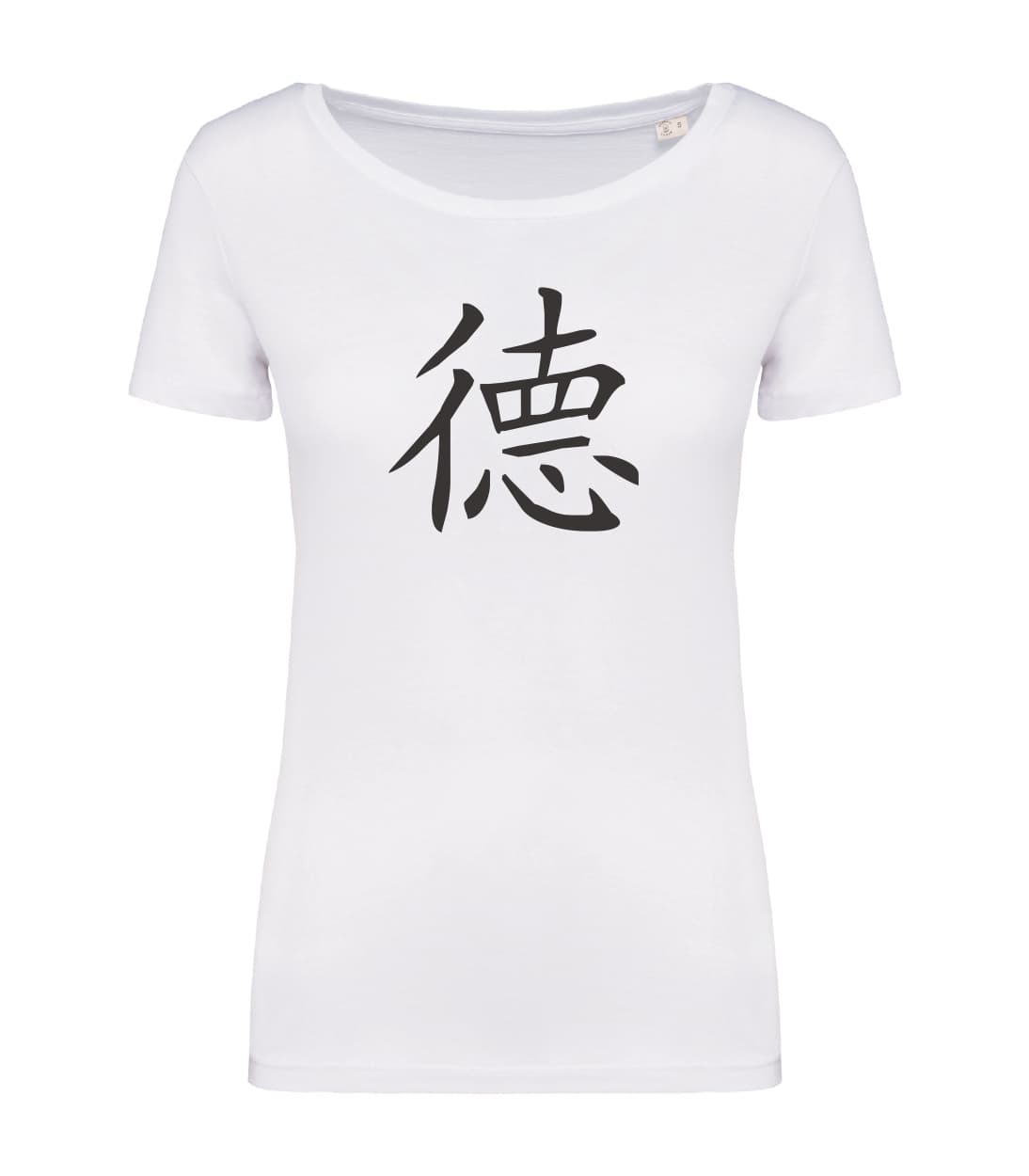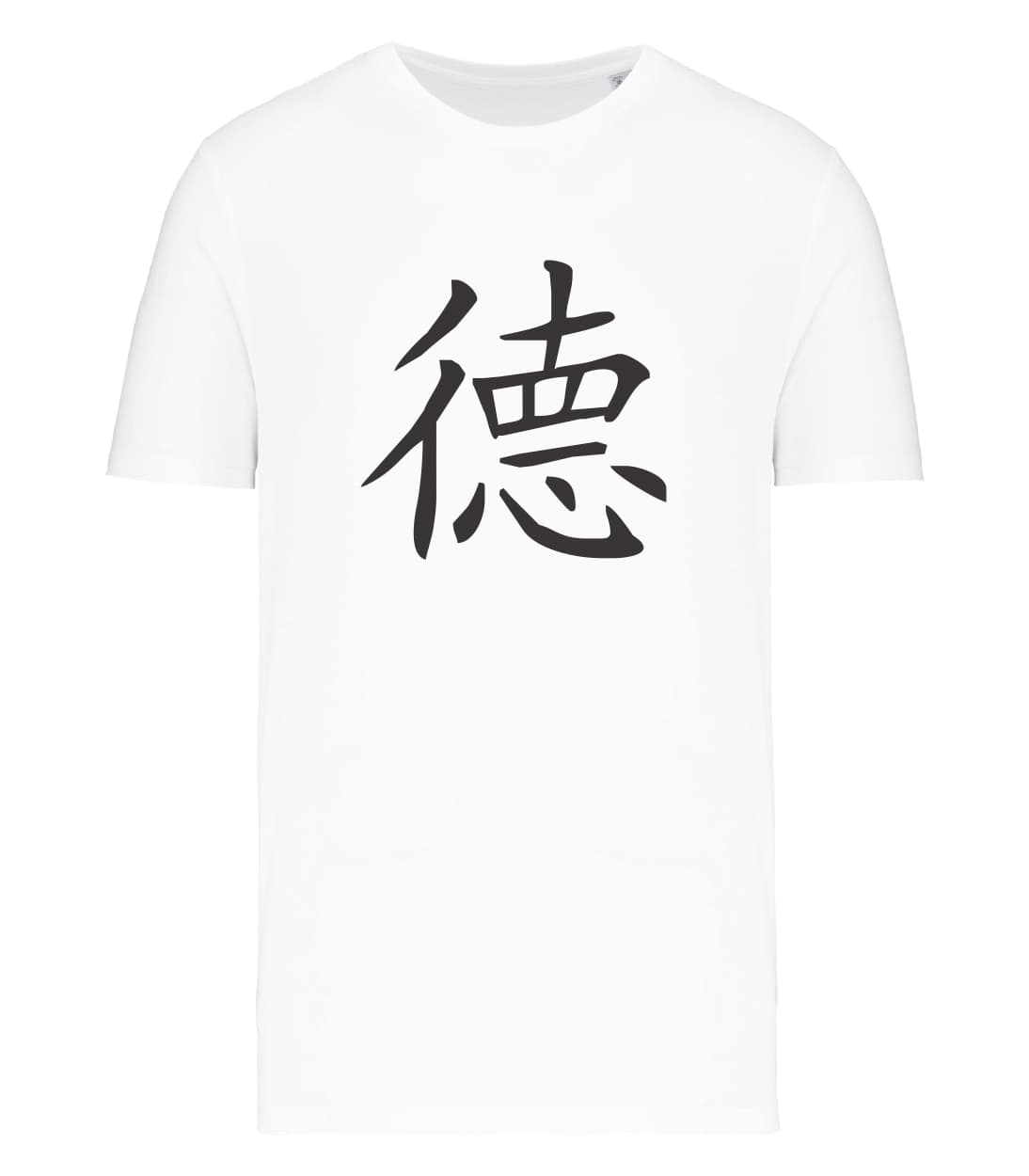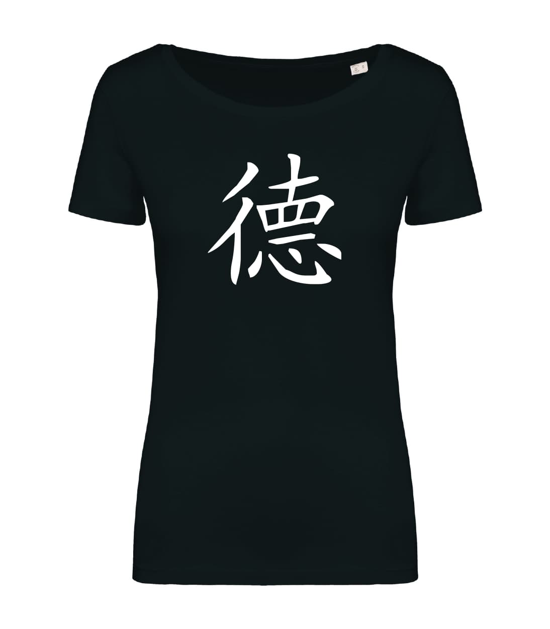 Il simbolo cinese della virtù combina due ideogrammi: 彳e 悳 . La componente 彳 significa “camminare” o “viaggiare”, ma può essere anche intesa come “comportamento”. La componente 悳 è a sua volta formata da 直 (zhí), cioè “dritto”, e 心 (xīn) cioè “cuore”. Da questa unione deriva il significato di “camminare dritti con il cuore”, cioè di comportarsi in maniera virtuosa.