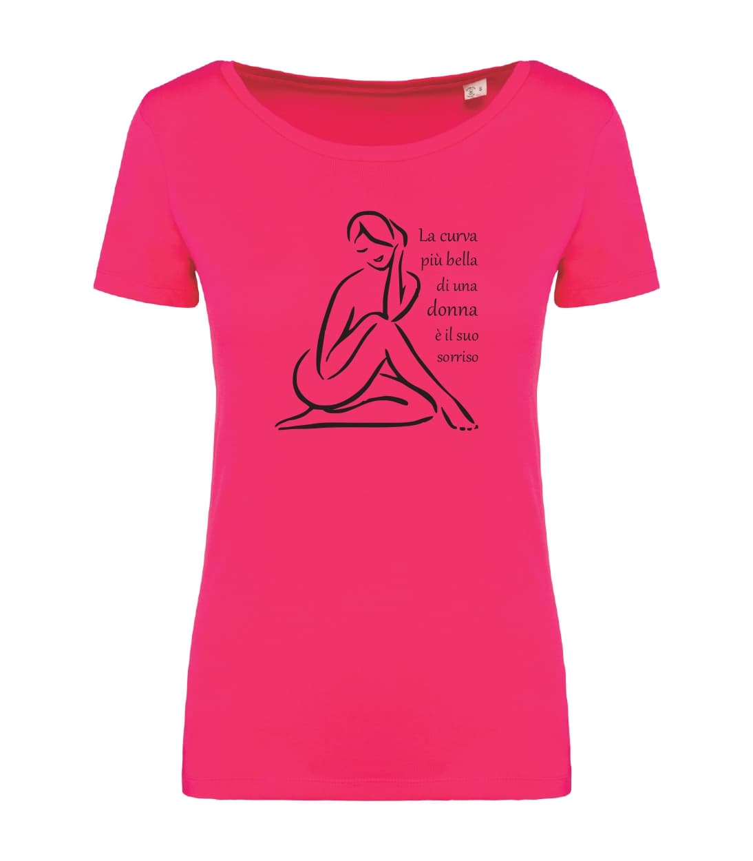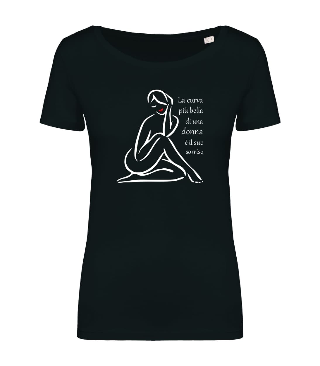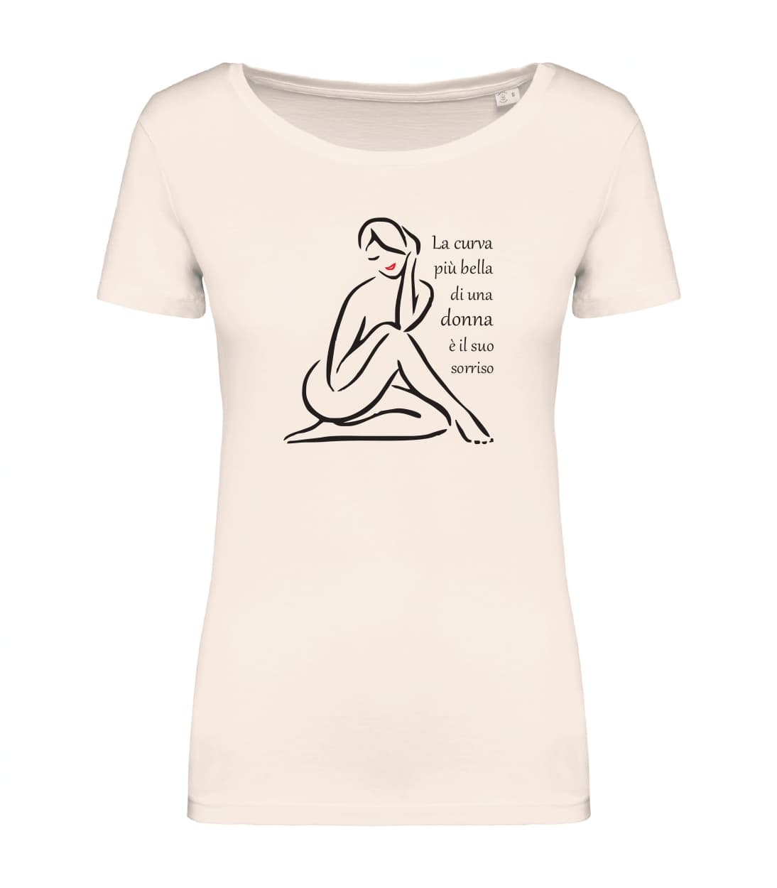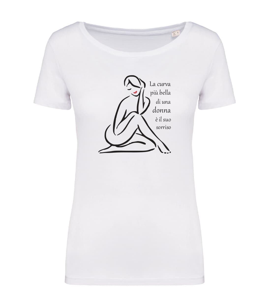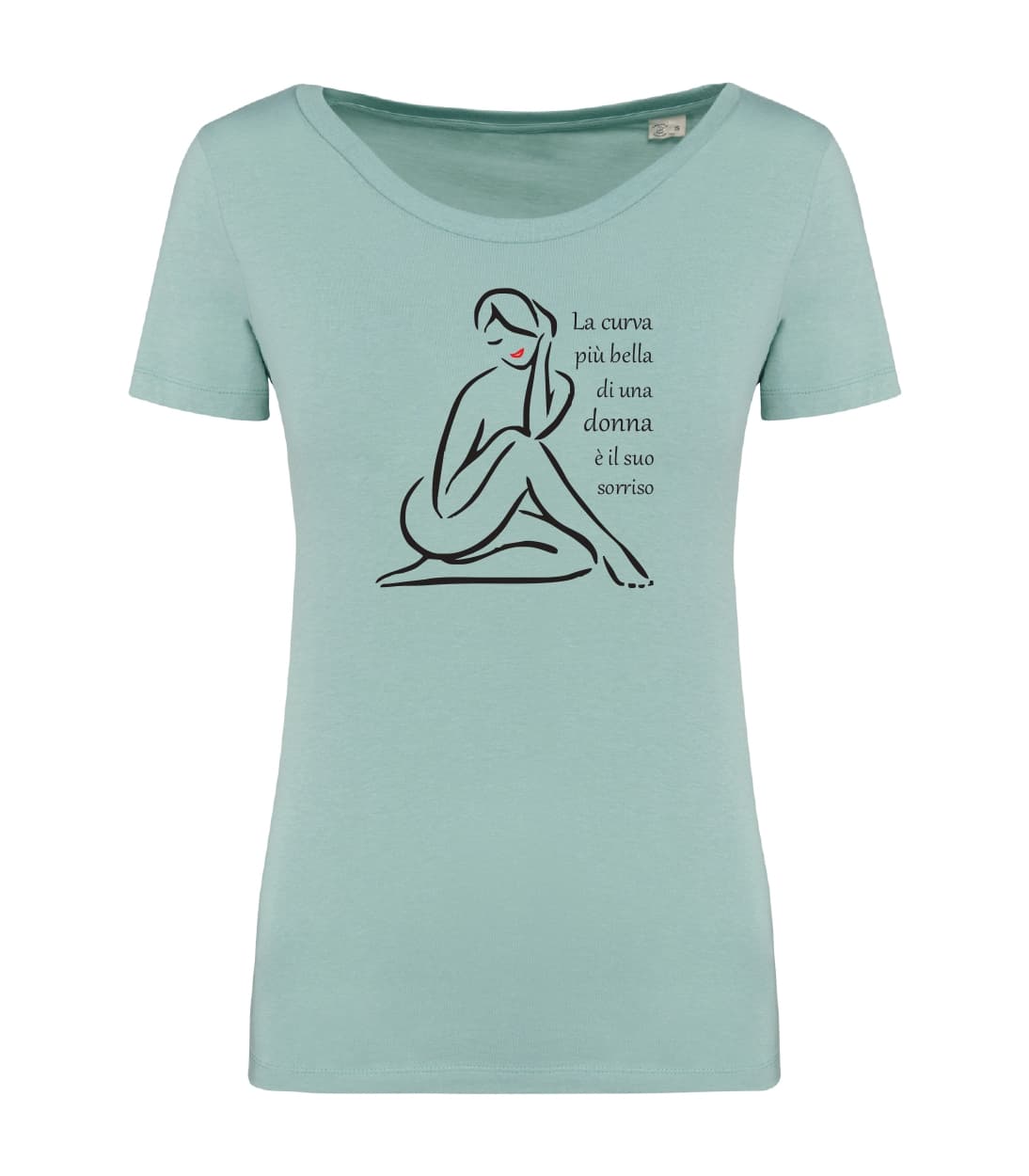 100% cotone biologico pettinato. Taglio aderente. Cuciture laterali. Capo con lavaggio agli enzimi. Collo a costine 1 x 1. Nastrino di rinforzo nel tessuto principale all’interno del collo. Finitura a doppia impuntura a fondo manica e fondo capo. Certificato STANDARD 100 by OEKO-TEX®N°CQ1007/7, IFTH