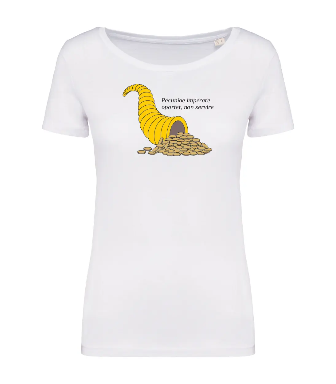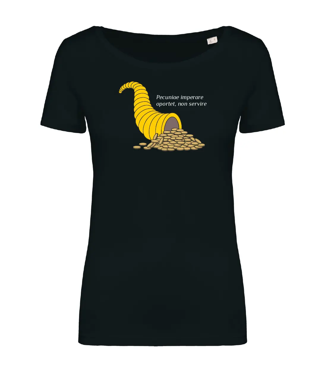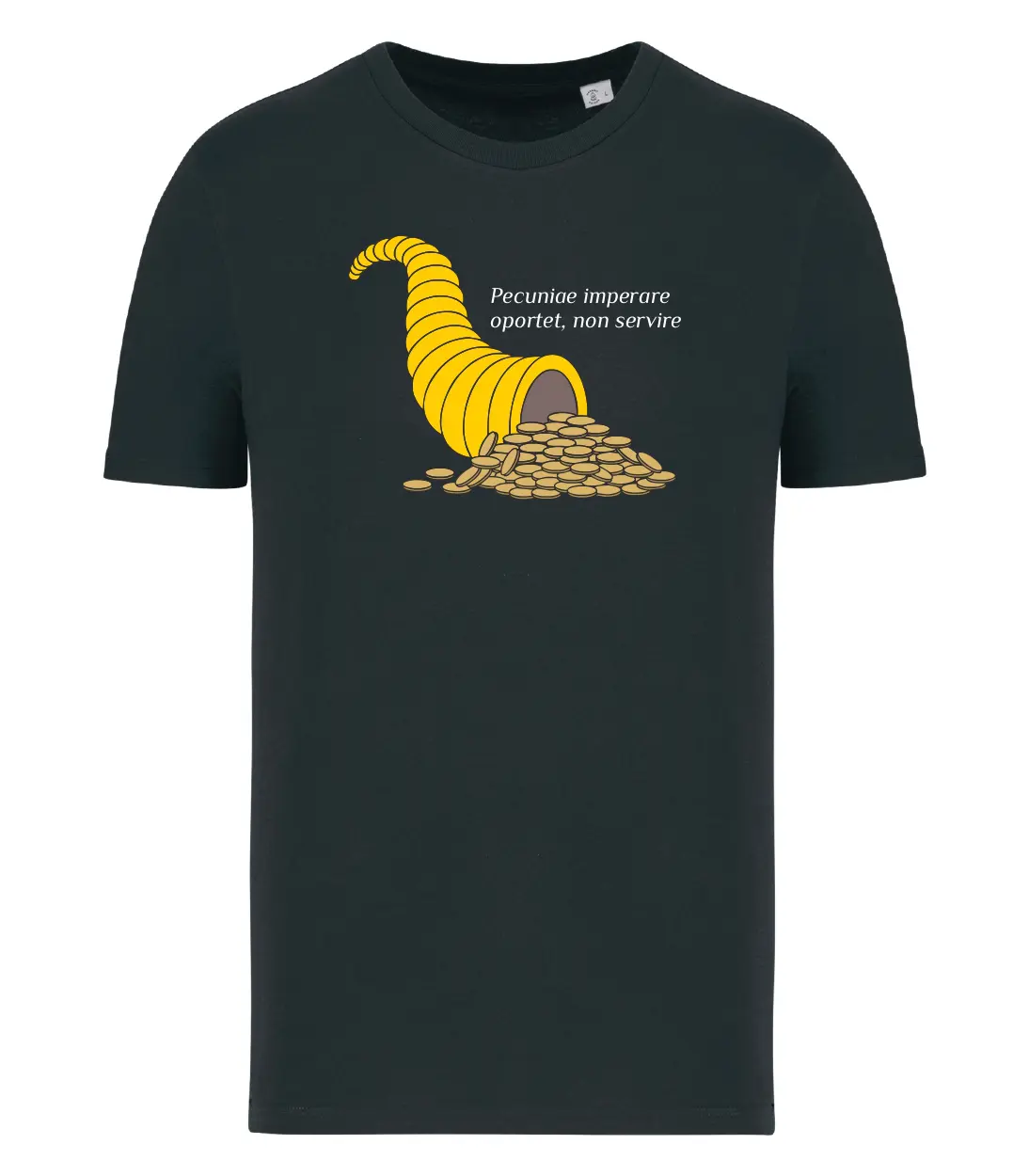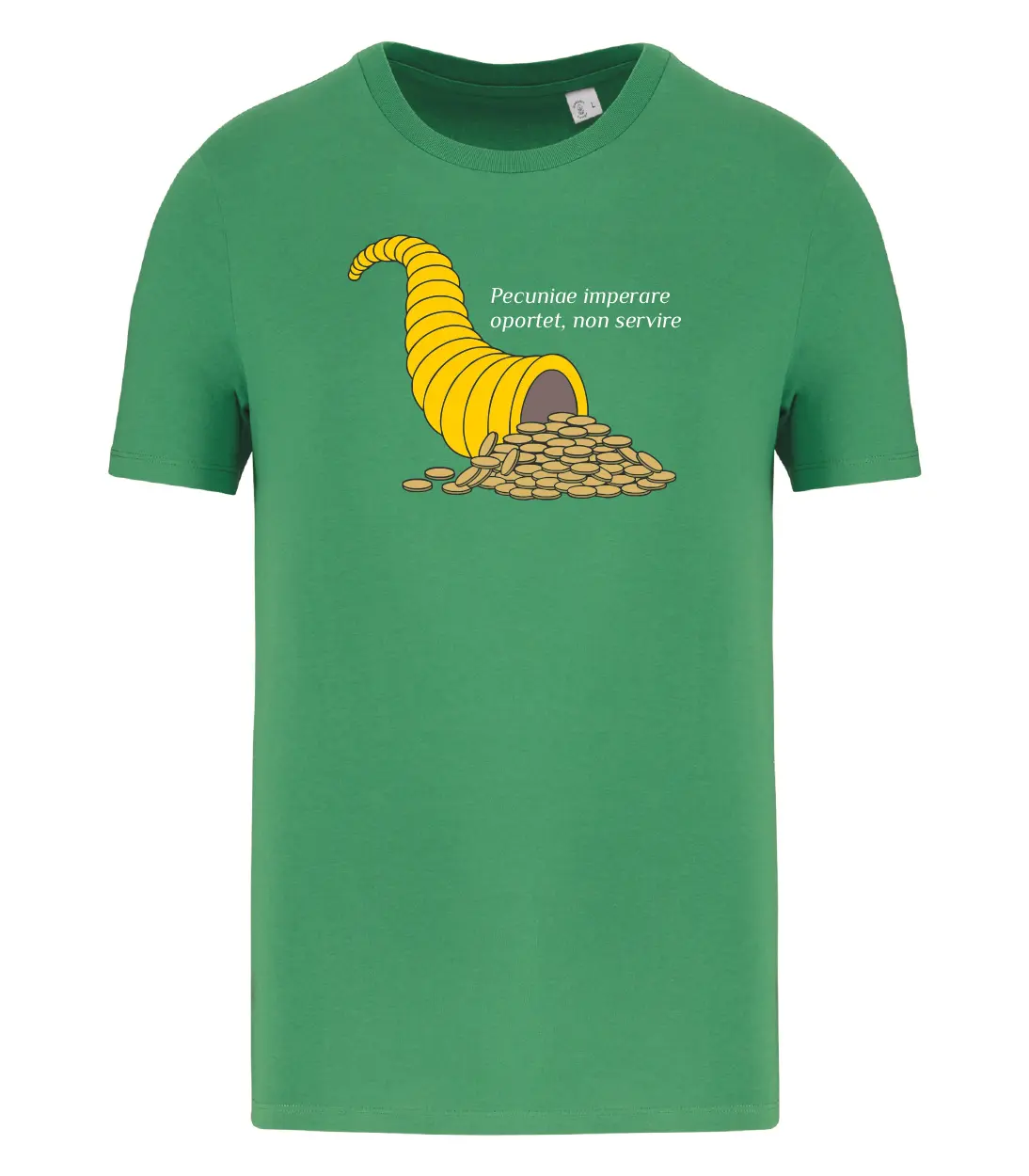 Dal latino cornu (corno) e copia (abbondanza), è da secoli un simbolo mitologico di buon auspicio di cibo e abbondanza. Si trova in mano ai Lari e alla dea Fortuna. Mentre il significato del testo latino è: Bisogna comandare il denaro, non servirlo.